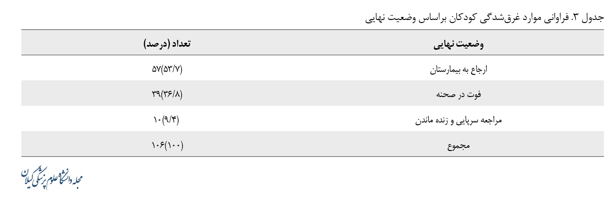 در طول ۵ سال مطالعه ۶۳ نفر (۵۹/۵ درصد) از کودکان در اثر حادثه غرقشدگی جان خود را از دست دادند (جداول شماره 3 و 4). ۳۹ نفر از این کودکان غرقشده، در صحنه حادثه فوت شدند.