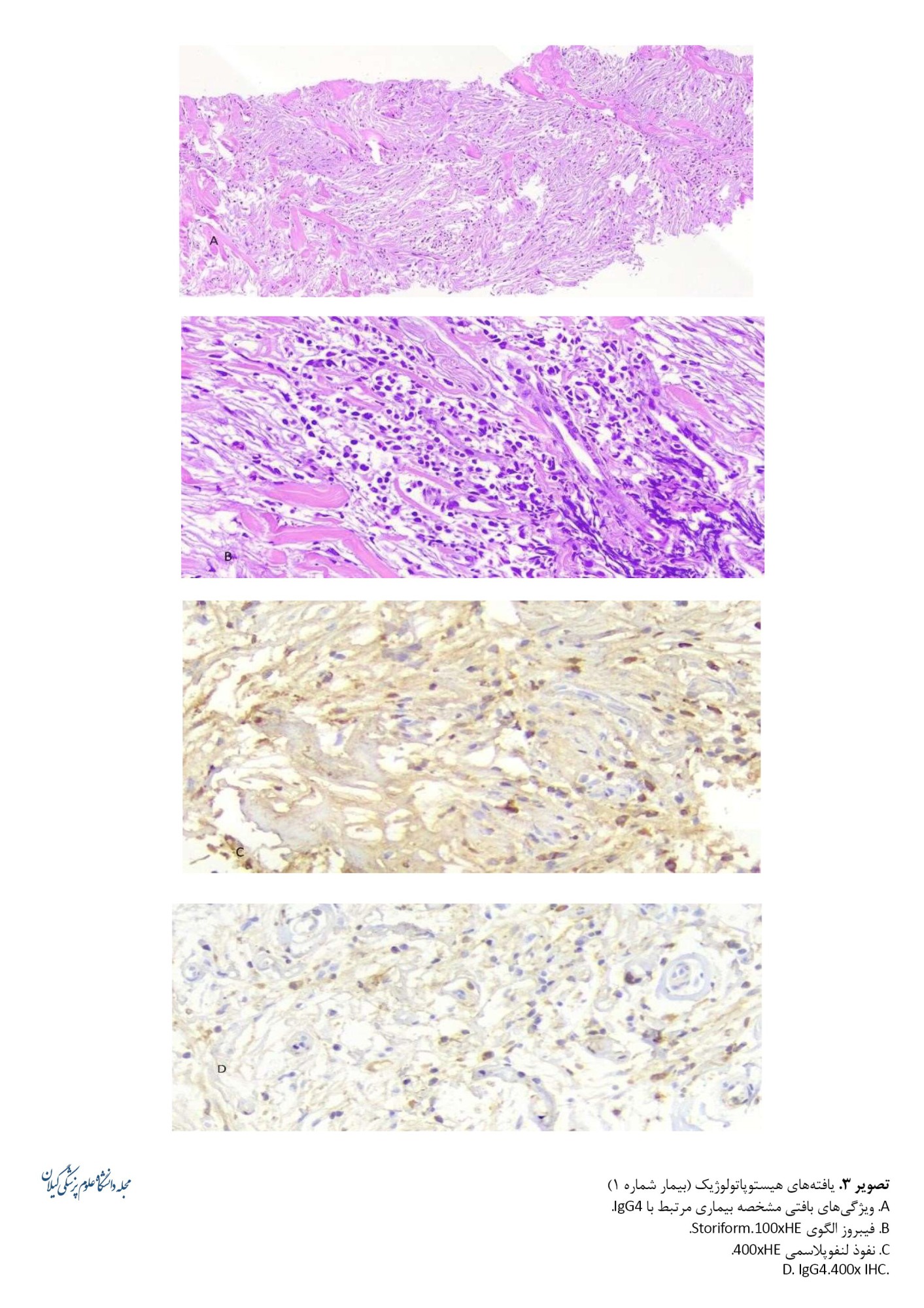 بیوپسی سوزنی از توده خلفیصفاقی تحت هدایت سیتیاسکن انجام شد و گزارشهای پاتولوژی نشاندهنده انفیلتراسیون لنفوپلاسمیتیک patchy بین رشتههای عضلانیاسکلتی در توده بود. در سلولهای پلاسما، نتایج آزمایشات آنتیژنی نشان داد کهCD3 ،(low) ،CD20 (low) ،B-catenin (منفی)، SMA (مثبت)، CD34 (منفی) و IgG4 (مثبت) بود (