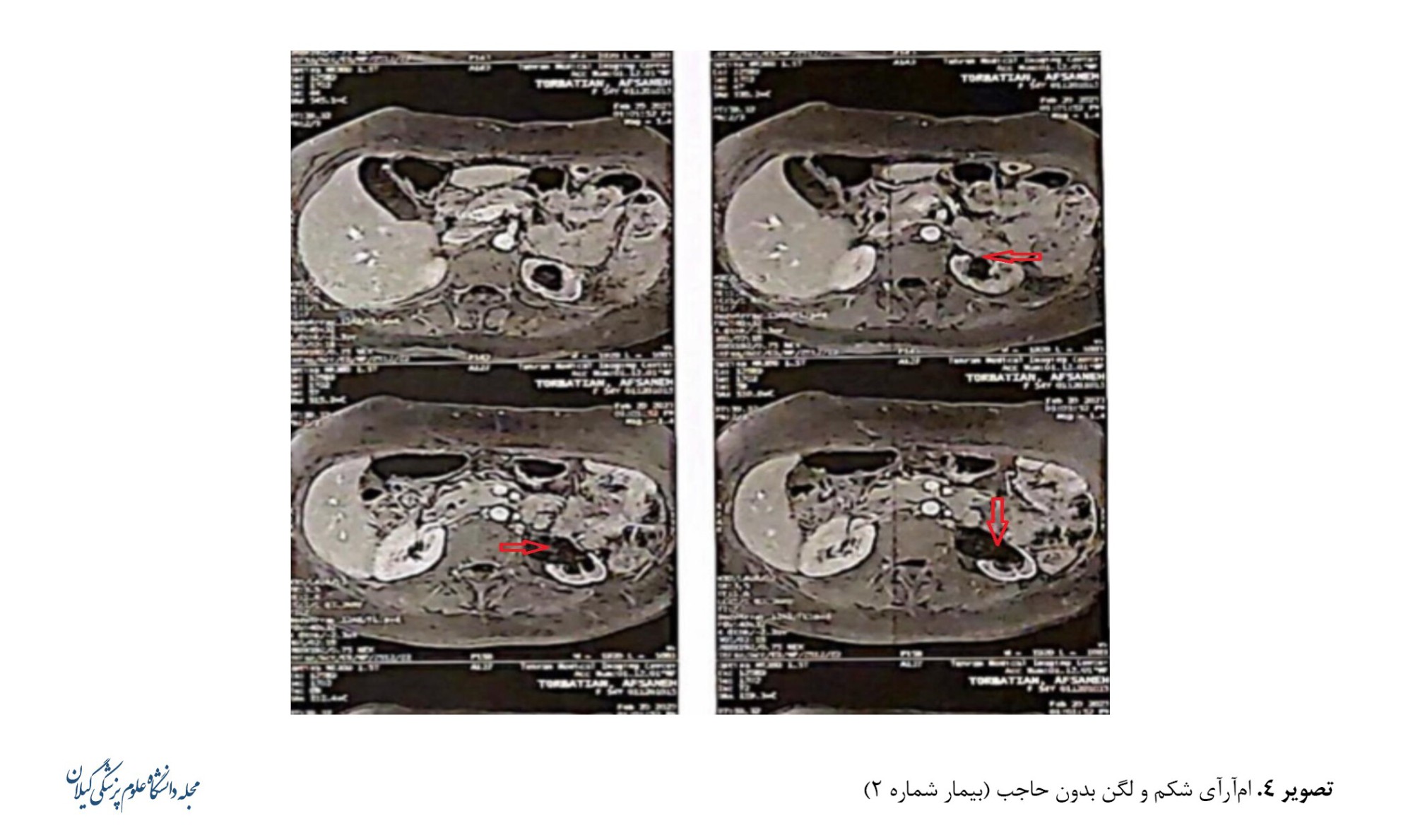به دلیل افزایش هیدرونفروز و افزایش کراتینین، بیمار تحت نفروستومی دوطرفه از راه پوست قرار گرفت. پس از کاهش کراتینین، تصویربرداری رزونانس مغناطیسی شکم و لگن بدون حاجب برای بیمار انجام شد که توده خلفیصفاقی در اطراف آئورت و ورید اجوف تحتانی را تأیید کرد (