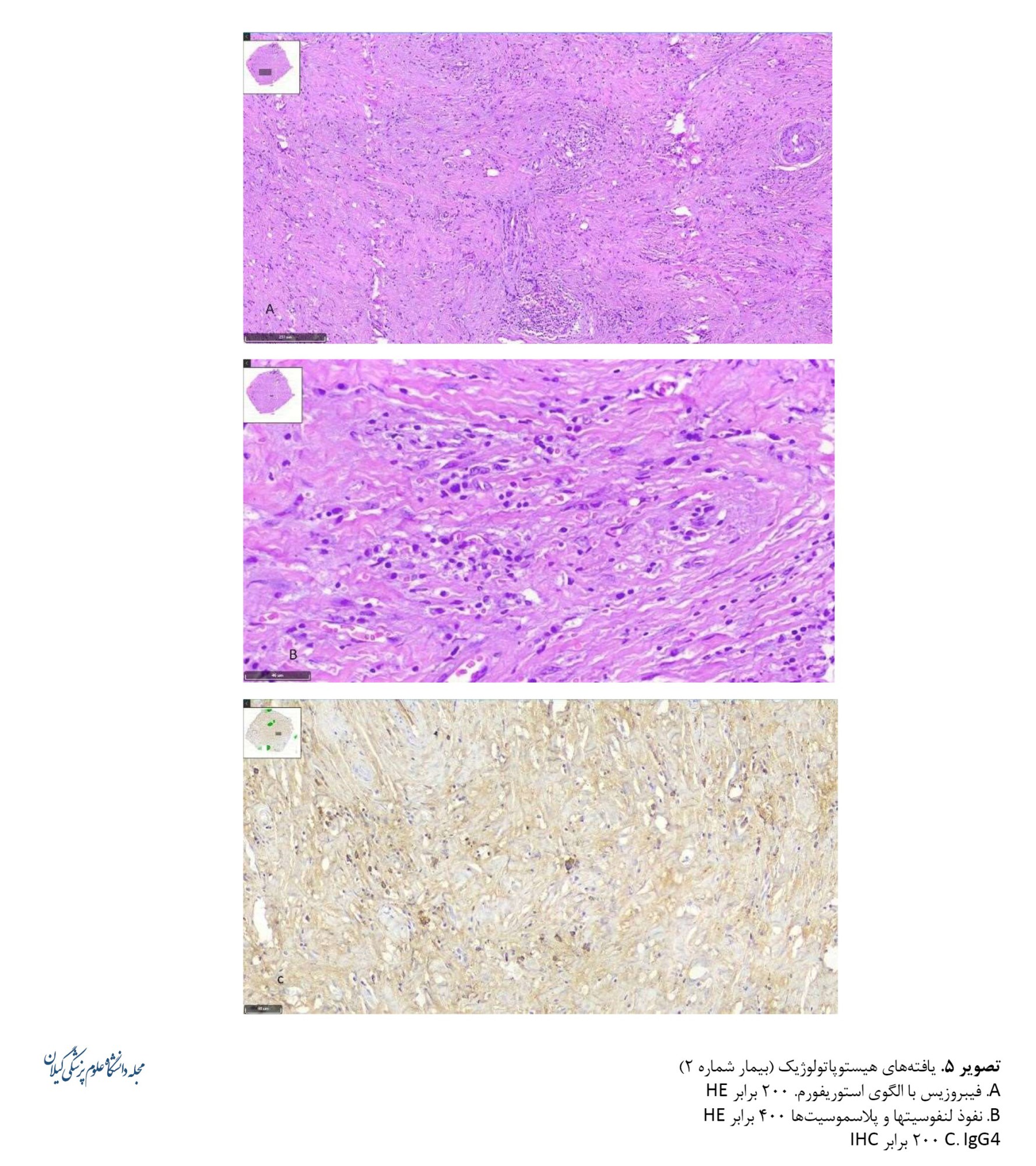 تصویر شماره 5). سلولهای پلاسما با IgG4/IgG بیشتر از 40 درصد بدون شواهدی از بدخیمی تأیید شد. ایمونوهیستوشیمی برای لنفوم کیناز آناپلاستیک منفی بود و H-CALDesmon ساختار عضلانی طبیعی را نشان داد. سطح IgG 1850 میلیگرم در دسیلیتر (700-1600 میلیگرم در دسیلیتر) و IgG4 149 میلیگرم در دسیلیتر (3/9-86/4 میلیگرم بر دسیلیتر) بود. تستهای ANA ،Anti Ro ،Anti La و فاکتور روماتوئید منفی بود. بیمار با تشخیصIgG4-RD با پردنیزولون 40 میلیگرم به مدت 2 ماه تحت درمان قرار گرفت. بیمار 2 دُز یکگرمی ریتوکسیماب دریافت کرد و کورتیکواستروئید بهتدریج به 5 میلیگرم در روز کاهش یافت. در پیگیریهای بعدی به مدت 1 سال، اندازه توده خلفیصفاقی در سونوگرافی و امآرآی شکم کاهش یافت و با وجود نرمال شدن سطح کراتینین، در اسکن کلیه، کلیه چپ آتروفیک بود و عملکرد نداشت.