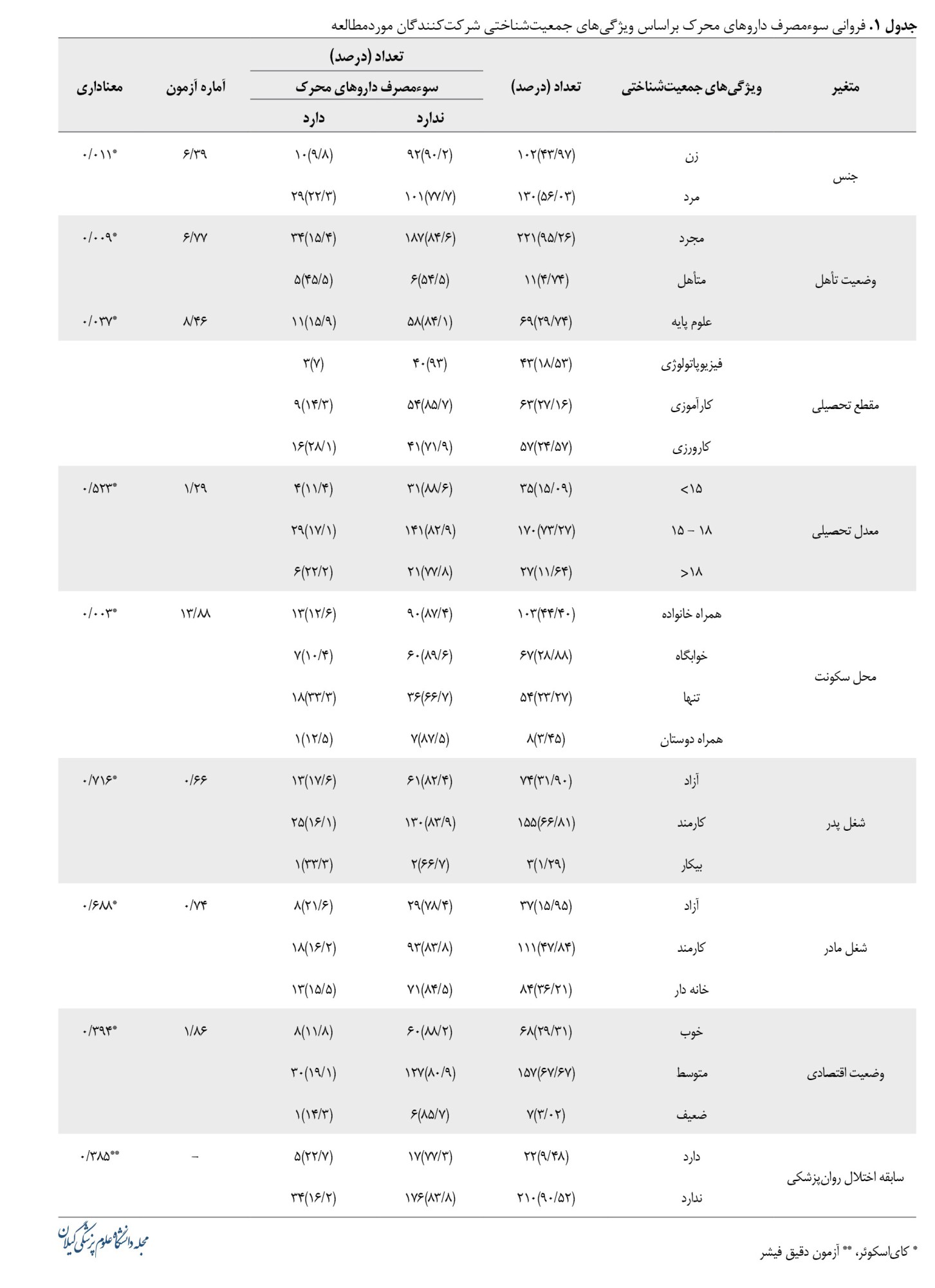 برخلاف مطالعه حاضر و مطالعه حبیبزاده و همکاران [5]در تبریز و همچنین مطالعه فلاح و همکاران [6] در بابل که فراوانی مصرف محرکها در مردان بالاتر بود، در مطالعه فوند و همکاران [37] در فرانسه ارجحیت جنسی بین مصرفکنندگان و گروهی که مصرف نمیکنند وجود نداشت. به نظر میرسد عوامل فرهنگی و اجتماعی در این تفاوت مؤثر باشد که نیازمند بررسیهای بیشتر است.