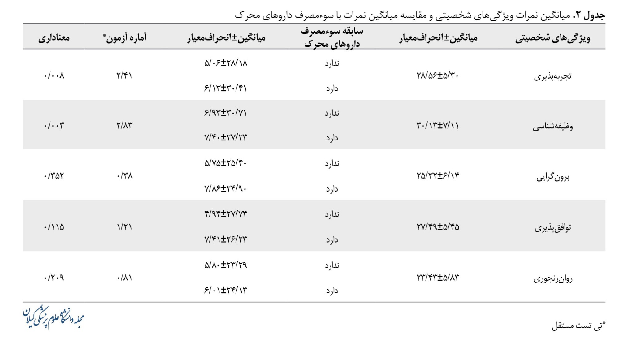 میانگین نمرات نمونه موردمطالعه در 5 حوزه شخصیت (براساس پرسشنامه پنچعاملی نئو) و ارتباط آنها با سوءمصرف داروهای محرک در جدول شماره 2 ارائه شد. شرکتکنندگان در ویژگی شخصیت وظیفهشناسی بالاترین میانگین و در ویژگی شخصیت روانرنجوری کمترین میانگین را کسب کردند. براساس نتایج بین ویژگیهای شخصیتی تجربهپذیری (0/008=p) و وظیفهشناسی (0/003=p) با سابقه سوءمصرف داروهای محرک ارتباط معناداری مشاهده شد. میانگین نمره اشتیاق به تجربیات جدید در افرادی که سوءمصرف داروهای محرک داشتند بالاتر بود. همچنین میانگین نمره وظیفهشناسی در این افراد پایینتر بود.