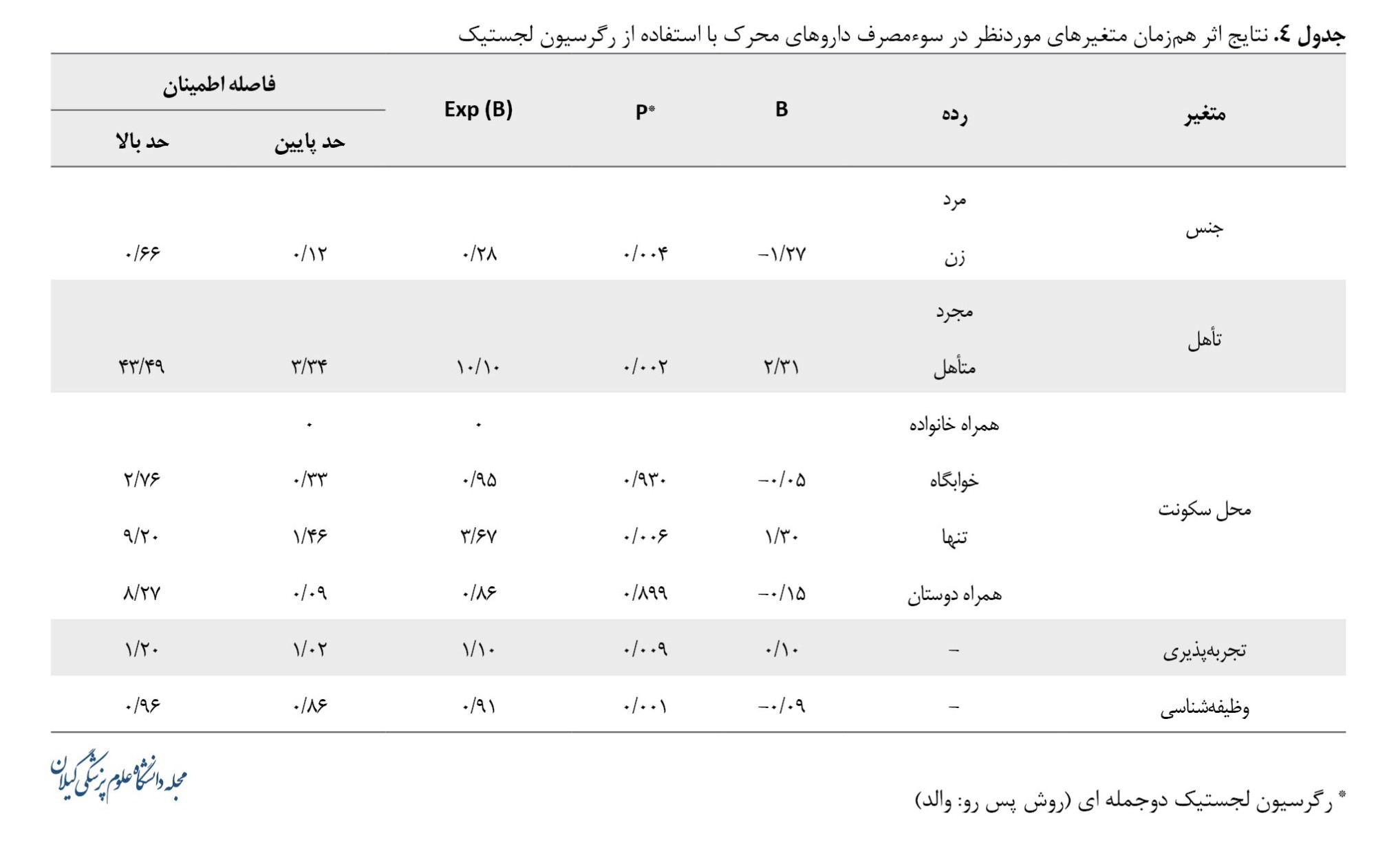 جدول شماره 4 نتایج اثر همزمان متغیرهای موردنظر در سوءمصرف داروهای محرک را نشان میدهد. جهت برازش مدل رگرسیون ابتدا متغیرهای مستقلی که با متغیر پاسخ (مصرف داروهای محرک) ارتباط معنادار داشتند انتخاب و وارد مدل رگرسیون لجستیک شدند. سپس از روش پسرو والد جهت انتخاب مدل نهایی استفاده شد. براساس نتایج جنسیت، تأهل، محل سکونت، تجربهپذیری و وظیفهشناسی متغیرهای معنادار شناخته شدند. شانس مصرف داروهای محرک در زنان 0/28 برابر مردان بود. در افراد متأهل 10/10 برابر افراد مجرد بود. در افراد تنها 3/67 برابر افرادی بود که همراه خانواده زندگی میکردند. با افزایش نمره تجربهپذیری بخت مصرف 1/10 افزایش مییابد. با افزایش نمره وظیفهشناسی بخت مصرف 0/91 کاهش مییابد.