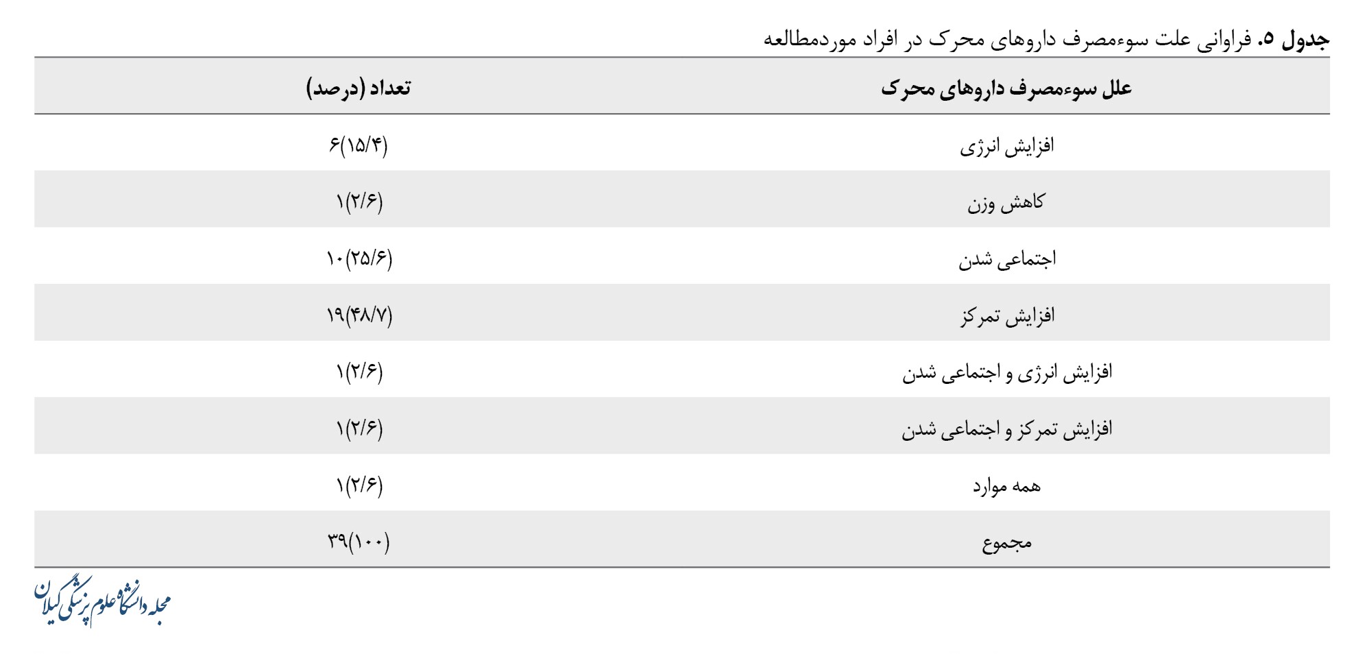 جدول شماره 5 فراوانی سوءمصرف داروهای محرک در دانشجویان پزشکی دانشگاه علومپزشکی گیلان براساس علت مصرف را نشان میدهد. براساس نتایج بیشترین فراوانی مربوط به افزایش تمرکز با 19 نفر (48/7 درصد) بود.