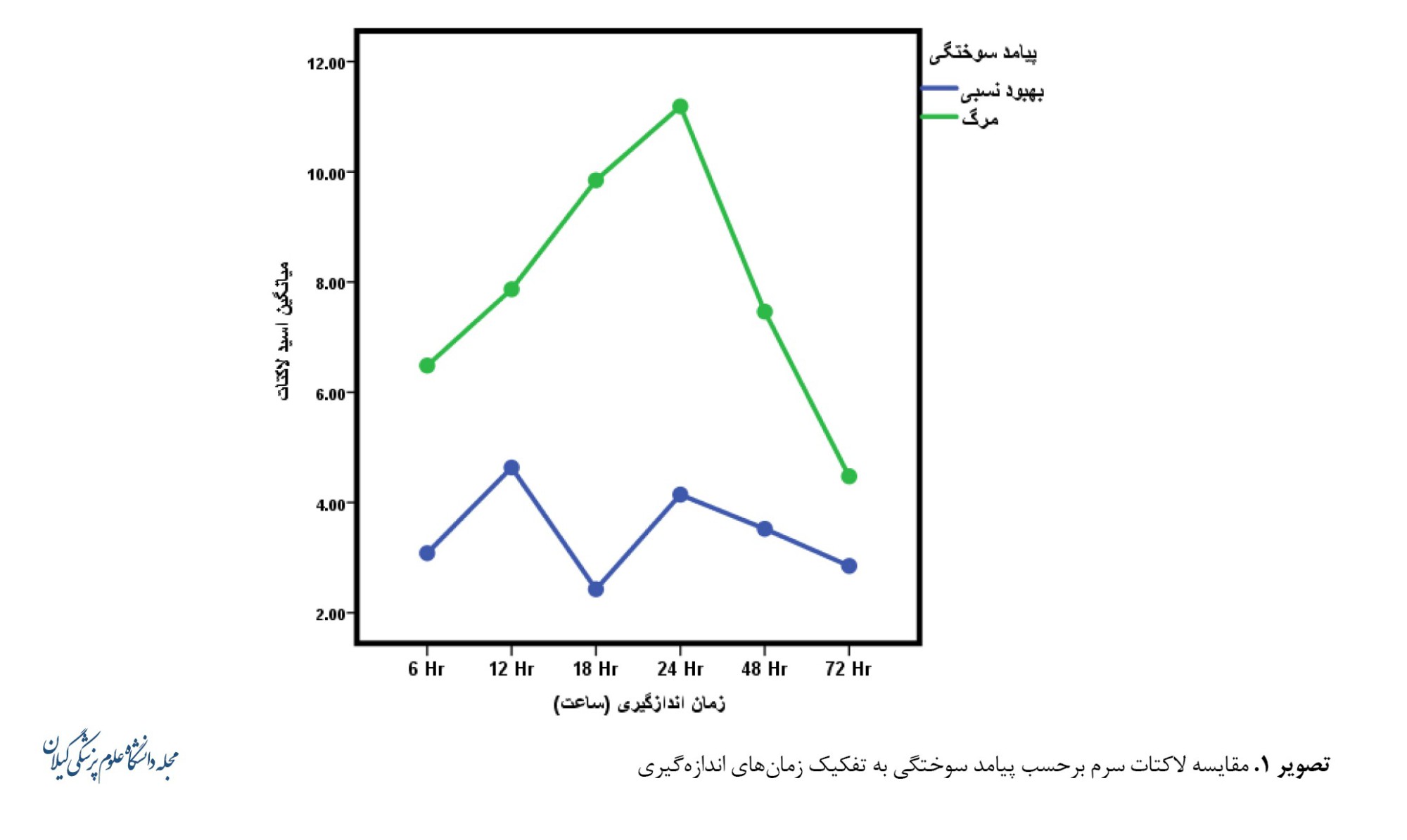 در مقایسههای درونگروهی تغییرات اسید لاکتیک در گروهی که بهبودی نسبی داشتهاند بهطورکلی کاهش معنیداری داشته است. اما در گروه بیماران دچار مرگ اگرچه تغییرات معنیدار بوده است، اما با افزایش اسید لاکتیک بعد از ۶ ساعت اول روبهرو بودهایم. این افزایش لاکتات میتواند دلیل کاهش پرفیوژن بافتی باشد که درصورتیکه این کاهش پرفیوژن در ارگانهای حساس اتفاق افتاده باشد، صدمات جبرانناپذیری به این ارگانها وارد خواهد شد. در مطالعه کوکران و همکاران بیان شده است که آنچه درمورد لاکتات حائز اهمیت است این موضوع است که در افرادی که دچار مرگومیر شدند، سطح لاکتات تا ۳۶ ساعت پس از پذیرش به حالت عادی برنگشته است [16]. در این مطالعه نیز مشابه مطالعه ما سطح لاکتات سرمی در ساعات اولیه بستری در گروه بیمار دچار مرگومیر افزایش داشته است. ناتوانی در از بین بردن اسیدوز لاکتیکی خود بهعنوان یک فاکتور مرگومیر در بیماران سپسیس و ترومایی شناخته شده و کلیرانس لاکتات در مطالعات متفاوتی بهعنوان یک فاکتور پیشگوییکننده مرگومیر معرفی شده است.