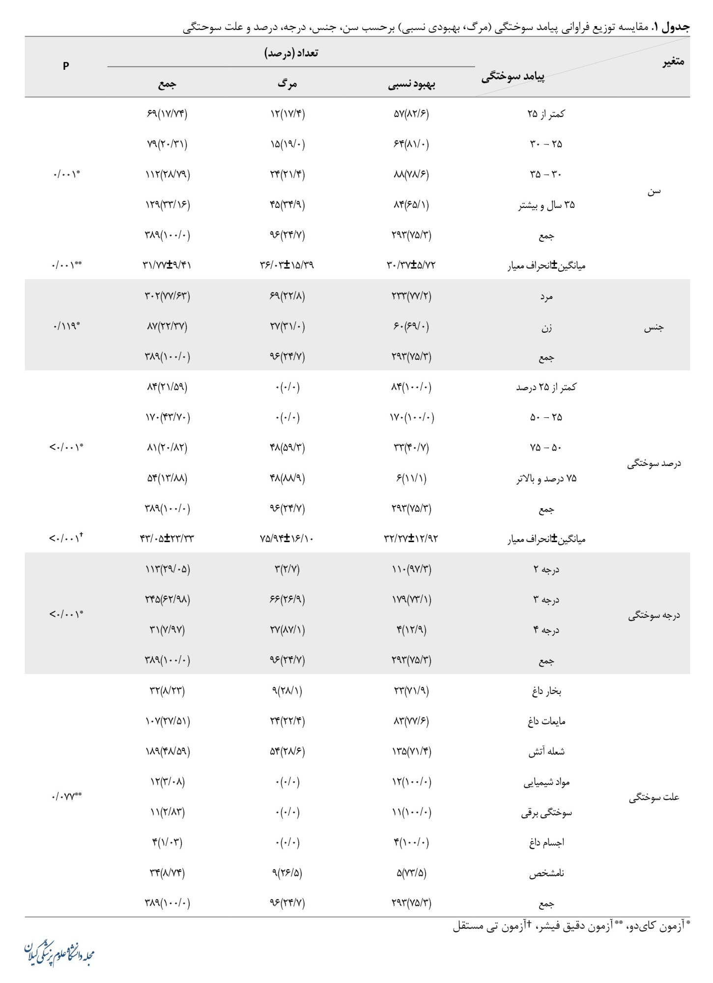 در جدول شماره 1 به مقایسه درصد مورتالیتی و بهبودی برحسب سن، جنس، درصد و درجه سوختگی و همچنین علت سوختگی پرداخته شده است. براساس اطلاعات این جدول، توزیع فراوانی پیامد سوختگی (مرگ یا بهبودی جسمی) برحسب گروه سنی (P=0/011)، درصد سوختگی (P<0/001) و درجه سوختگی (P<0/001) معنیدار بوده است. درصد مورتالیتی در گروه سنی ۳۵ سال و بیشتر، بیشتر از سایر گروههای سنی بوده است و همچنین میانگین سنی در موارد مرگ بیشتر از بهبودی نسبی بوده است. اطلاعات جدول شماره 1 نشان میدهد درصد مورتالیتی در بیماران با سوختگی۵۰ تا 75 درصد (59/2 درصد) و ۷۵ درصد بالاتر (88/9 درصد)، بیشتر از درجات پایینتر بوده است. میانگین درجات سوختگی در موارد مرگ بیش از 1/5 برابر میانگین درجه سوختگی بیماران با بهبود نسبی بوده است. درصد مورتالیتی برحسب درجه سوختگی درجه ۴، 78/1 درجه ۳، 26/9 و درجه ۲، 2/7 درصد بوده است. درصد مورتالیتی برحسب جنس و همچنین علت سوختگی معنیدار نبوده است (از لحاظ آماری).