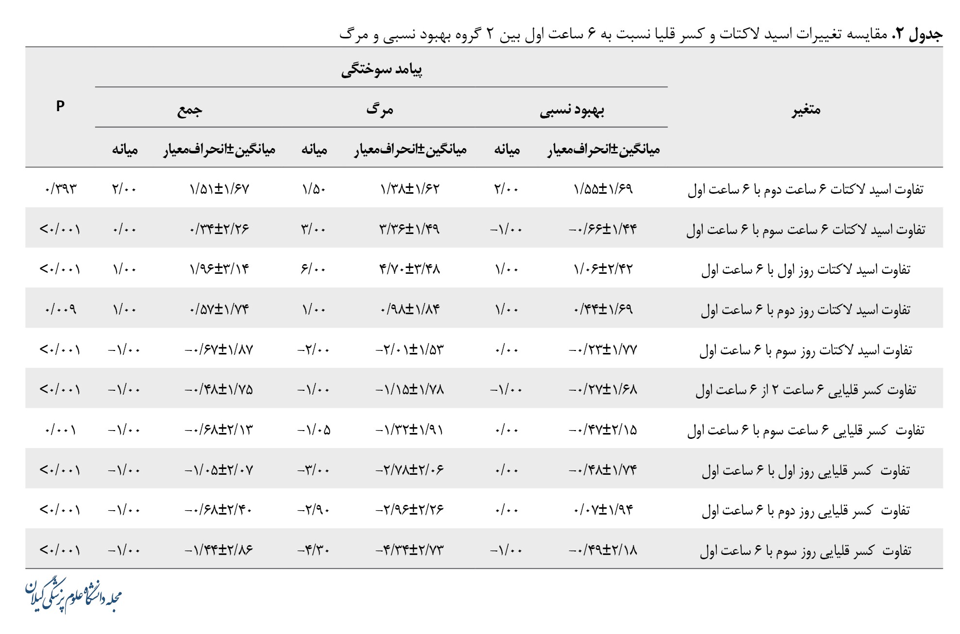 در جدول شماره 2 به مقایسه تغییرات اسید لاکتیک و کسر قلیا برحسب پیامد سوختگی نشان داده شده است. براساس اطلاعات این جدول تفاوت اسید لاکتیک در همه زمانهای اندازهگیری نسبت به 6 ساعت اول ازلحاظ آماری بین 2 گروه بهبود نسبی و مرگ معنیدار بوده است (0/001>P). تغییرات اسید لاکتیک 6 ساعت دوم نسبت به 6 ساعت اول معنیدار نیست (0/393=P)