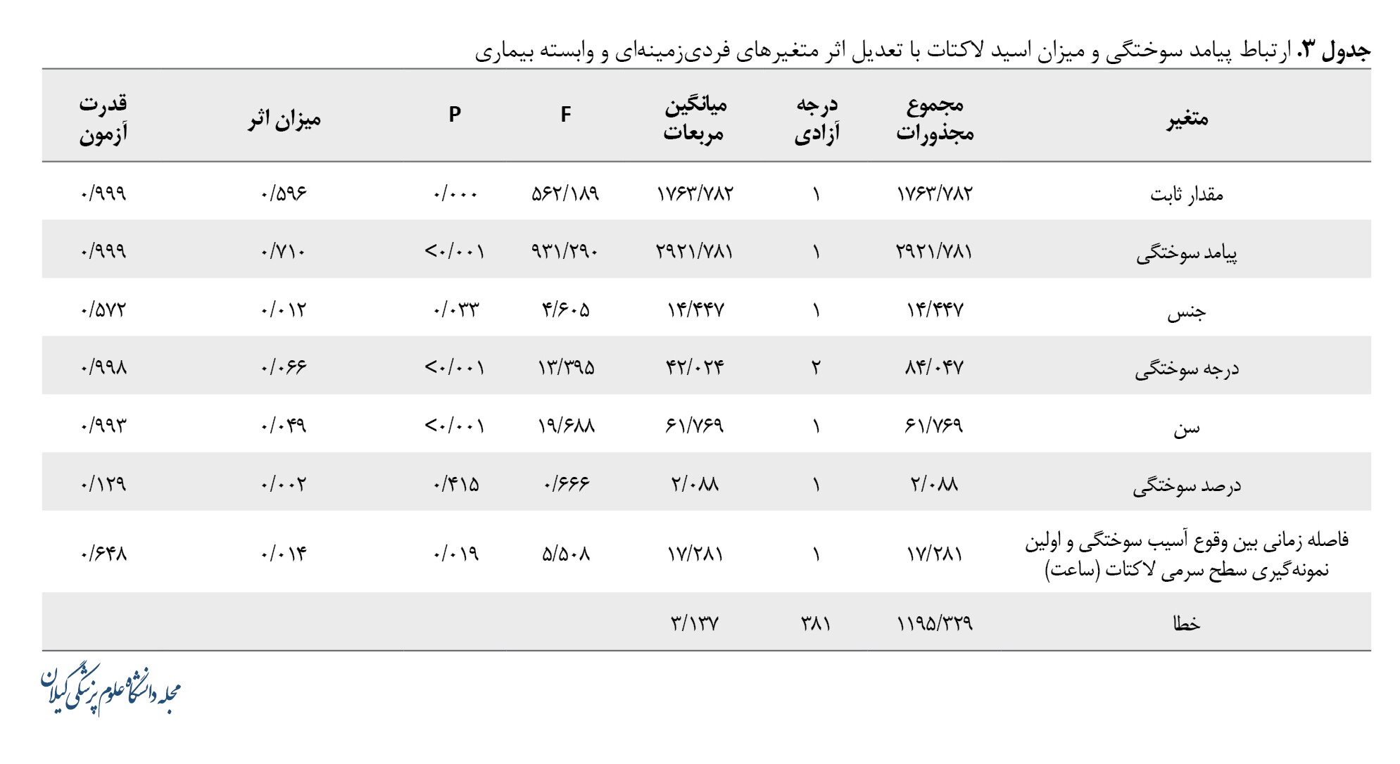 براساس اطلاعات جدول شماره 3 ارتباط جنس (0/033=P)، سن (0/001>P)، درجه سوختگی (0/001>P) و همچنین فاصله زمانی بین وقوع آسیب سوختگی و اولین نمونهگیری سطح سری لاکتات (0/019=P) نیز با میزان اسید لاکتات ارتباط معنیداری داشته است.