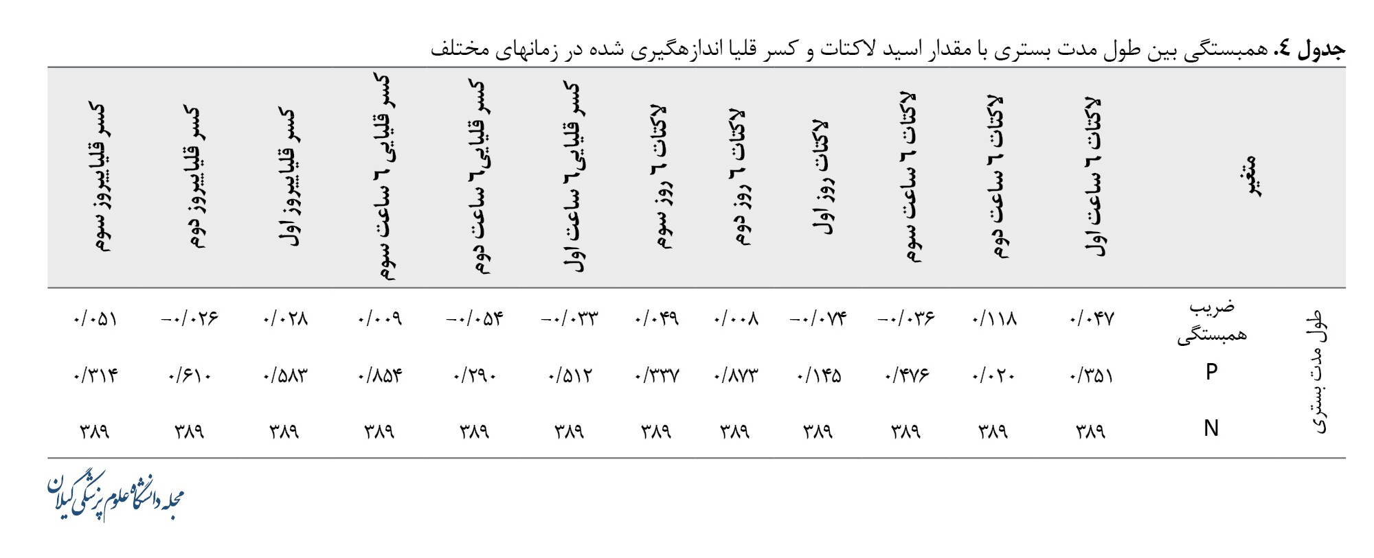 در جدول شماره 4 به همبستگی بین طول مدت بستری بهصورت کمی برحسب روز با مقدار اسید لاکتات و کسر قلیا براساس ضریب همبستگی پیرسون پرداخته شده است. براساس نتایج این جدول ارتباط طول مدت بستری با میزان اسید لاکتات و کسر قلیا در ساعات اندازهگیریشده ارتباط معنیداری نداشته است (P>0/05). تنها ضریب همبستگی طول مدت بستری با میزان الکتات 6 ساعت دوم همبستگی معنیداری داشته است. (r=0/118, P=0/02) اما براساس تقسیمبندی ضریب همبستگی پیرسون این ارتباط در سطح خیلی پایینی است.