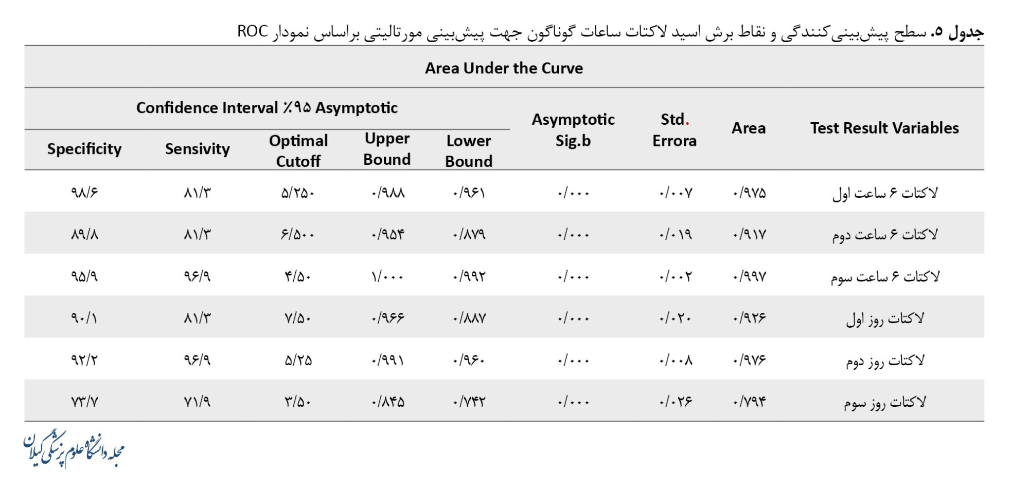 یافتههای این مطالعه نشان داده است ارتباط پیامد سوختگی (بهبود نسبی، مرگ) با میزان کسر قلیا و اسید لاکتیک معنیدار بوده است و این نتایج هم در آنالیز تکمتغیره و هم در آنالیز چندگانه پس از کنترل اثرات متغیرهای فردیزمینهای و وابسته به سوختگی استوار بوده است. بنابراین در ادامه برای داشتن یک نقطه برش مناسب، به تفکیک ساعات اندازهگیری اسید لاکتیک و کسر قلیا جهت پیشبینی مورتالیتی در بیماران براساس نمودار منحنی عملکرد تشخیصی (ROC) پرداخته شده است براساس تصویر شماره 2 و جدول شماره 5 سطح پیشبینیکنندگی اسید لاکتات تمامی ساعات برای پیشبینی مورتالیتی ازلحاظ آماری معنیدار بوده است (0/001>P).