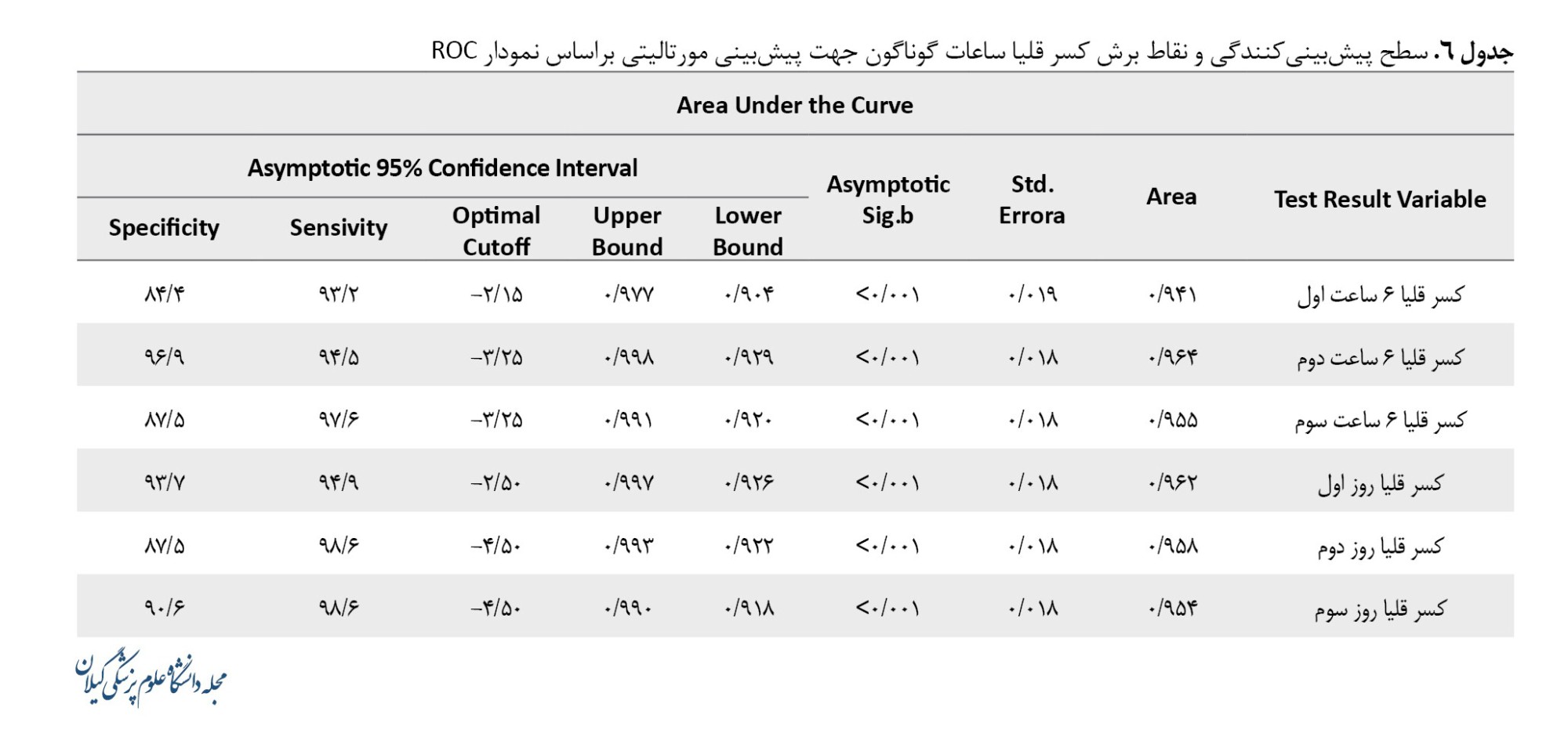 نتایج تحلیل منحنی ROC نشان داد متغیر کسر قلیا در تمامی بازههای زمانی موردبررسی (شش ساعت اول تا سوم و روز اول تا سوم پس از پذیرش) از دقت تشخیصی عالی برای پیشبینی پیامد بالینی برخوردار است (AUC بین 0/941 تا 0/964، 0/001>P). بالاترین مقدار AUC مربوط به شش ساعت دوم (0/964) با نقطه برش بهینه 3/25- بود که حساسیت 94/5 درصد و ویژگی 96/9 درصد نشان میداد حاکی از بهترین عملکرد تشخیصی در این بازه زمانی. مقادیر AUC در روزهای بعدی نیز بالا باقی ماند (0/954 درصد) با حساسیت بسیار بالا (تا 98/6 درصد) اگرچه ویژگی تا 87/5 درصد کاهش یافت. این یافتهها مؤید ارزش بالینی پایدار کسر قلیا بهعنوان نشانگر پیشآگهی در طول زمان است، با تأکید بر اهمیت ویژه پایش آن در 6 تا 12 ساعت اول پس از پذیرش.
