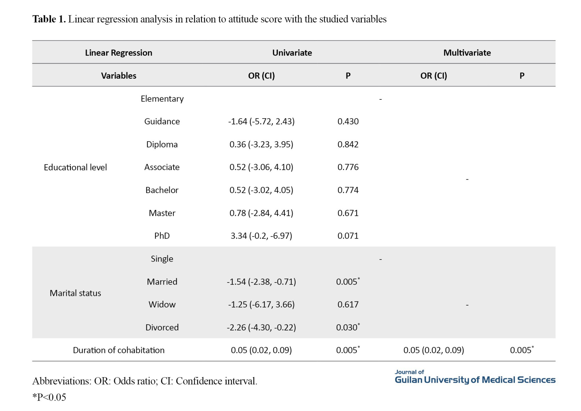 Based on univariate linear regression analysis, no significant relationship was observed between any of the educational levels and the attitude score (P>0.005). However, a significant relationship was observed between marital status and the duration of cohabitation, as well as the attitude score. In multivariate analysis, a significant relationship was observed only between duration of cohabitation and attitude score, meaning that a one-year increase in duration of cohabitation was associated with a decrease in the attitude score towards childbearing of 0.95 (P<0.005) (Table 1).