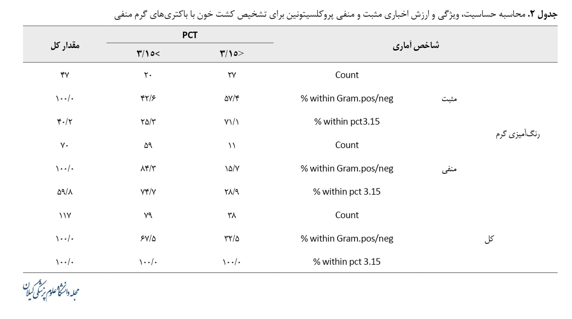 مقدار برش بهینه برای پروکلسیتونین برای تعیین پیشآگهی 3/00 نانوگرم در میلیلیتر، با حساسیت 88/9 درصد و ویژگی 69/2 درصد بود. ارزش اخباری مثبت 66/7 درصد و ارزش اخباری منفی 90 درصد برای باکتریهای گرم منفی بود (جدول شماره 3).