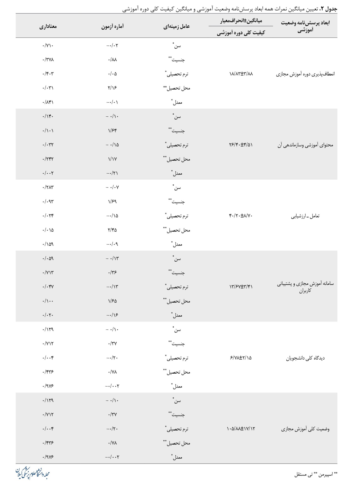 همچنین، براساس نتایج بهدستآمده متغیرهای سن، جنسیت، و محل تحصیل با بعد محتوای آموزشی و سازماندهی دوره آموزش مجازی ارتباط معناداری نداشتند(P>0/05). اما ترم تحصیلی با بعد محتوای آموزشی و سازماندهی ارتباط معکوس و معناداری داشت(P=0/032, r=-0/15). به طوریکه با افزایش ترم تحصیلی نمره بعد محتوای آموزشی و سازماندهی کاهش یافت. همچنین معدل با بعد محتوای آموزشی و سازماندهی ارتباط معناداری داشت (P=0/002, r=-0/21). به طوریکه با افزایش معدل، نمره بعد محتوای آموزشی و سازماندهی افزایش یافت (جدول شماره 2).
