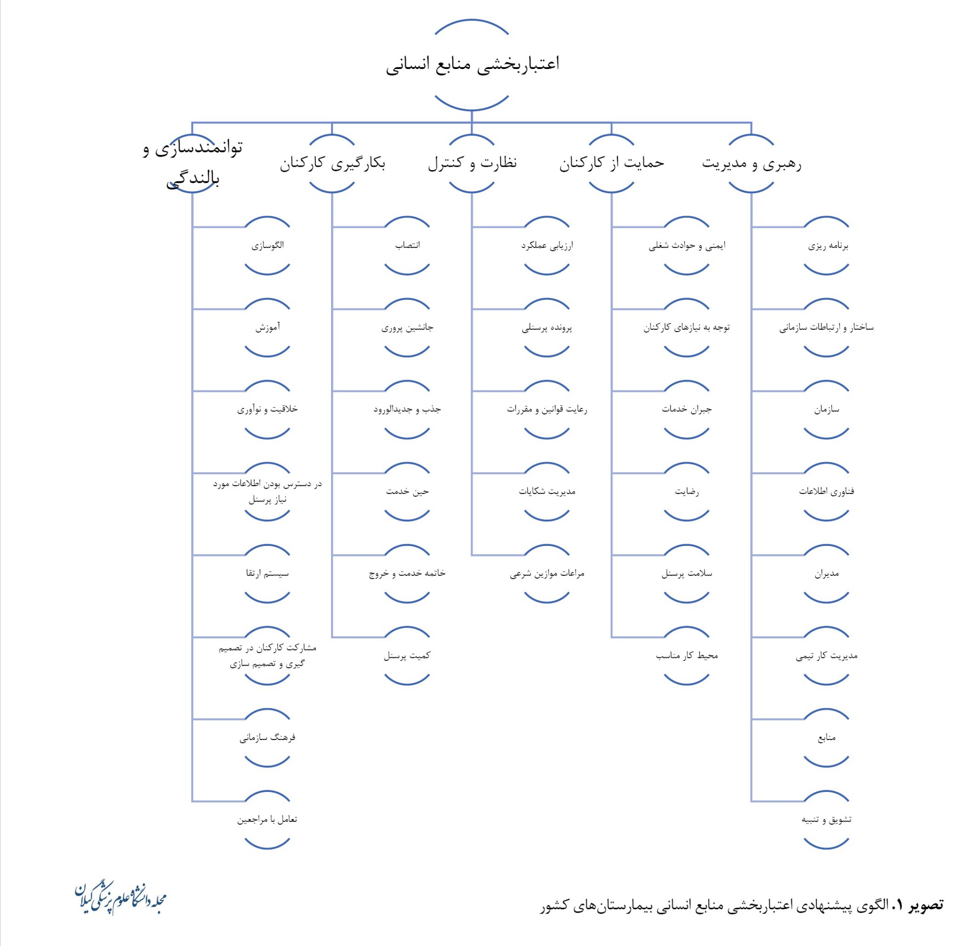 همچنین الگوی پیشنهادی اعتباربخشی منابع انسانی بیمارستانهای کشور که براساس یافتههای تحقیق به دست آمد، در تصویر شماره 1 ترسیم شده است.