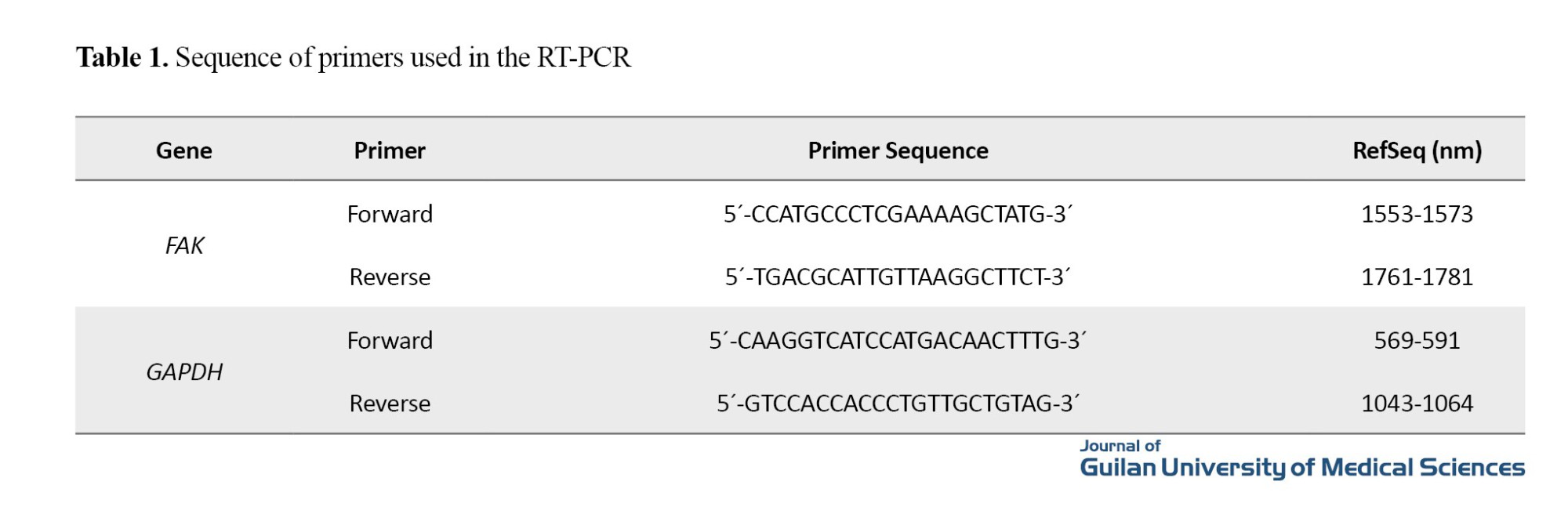 RNA was extracted from tumor tissues according to the manufacturer’s protocol. The primers required for the amplification of FAK and GAPDH genes (Table 1) were designed using this software. The Pars Toos kit was used for Complementary DNA (cDNA) synthesis. For real-time polymerase chain reaction (PCR), appropriate volumes of Mastermix, cDNA, and primers were mixed and brought up to 20 μL with sterile double-distilled water. The four-step PCR was programmed as follows: A 15-minute holding step at 95 °C, an initial 30-second denaturation step at 95 °C, a 30-second annealing step at 65 °C, and a 30-second extension step at 72 °C. All programs were run with at least three independent cDNA samples. Finally, the cycle threshold (CT) values of genes in the treated and control samples were calculated. The CT of the FAK was subtracted from the CT of the GAPDH, and the ΔCT value was obtained for the treated and control samples. The relative expression graph was displayed based on 2-ΔCT. Data were represented as Mean±SE. Statistical significance was set at P<0.05.