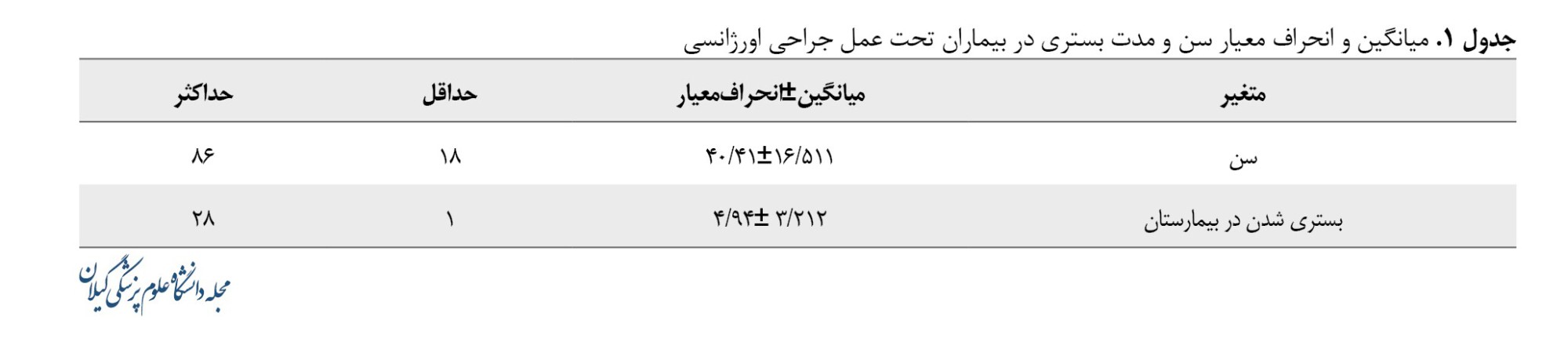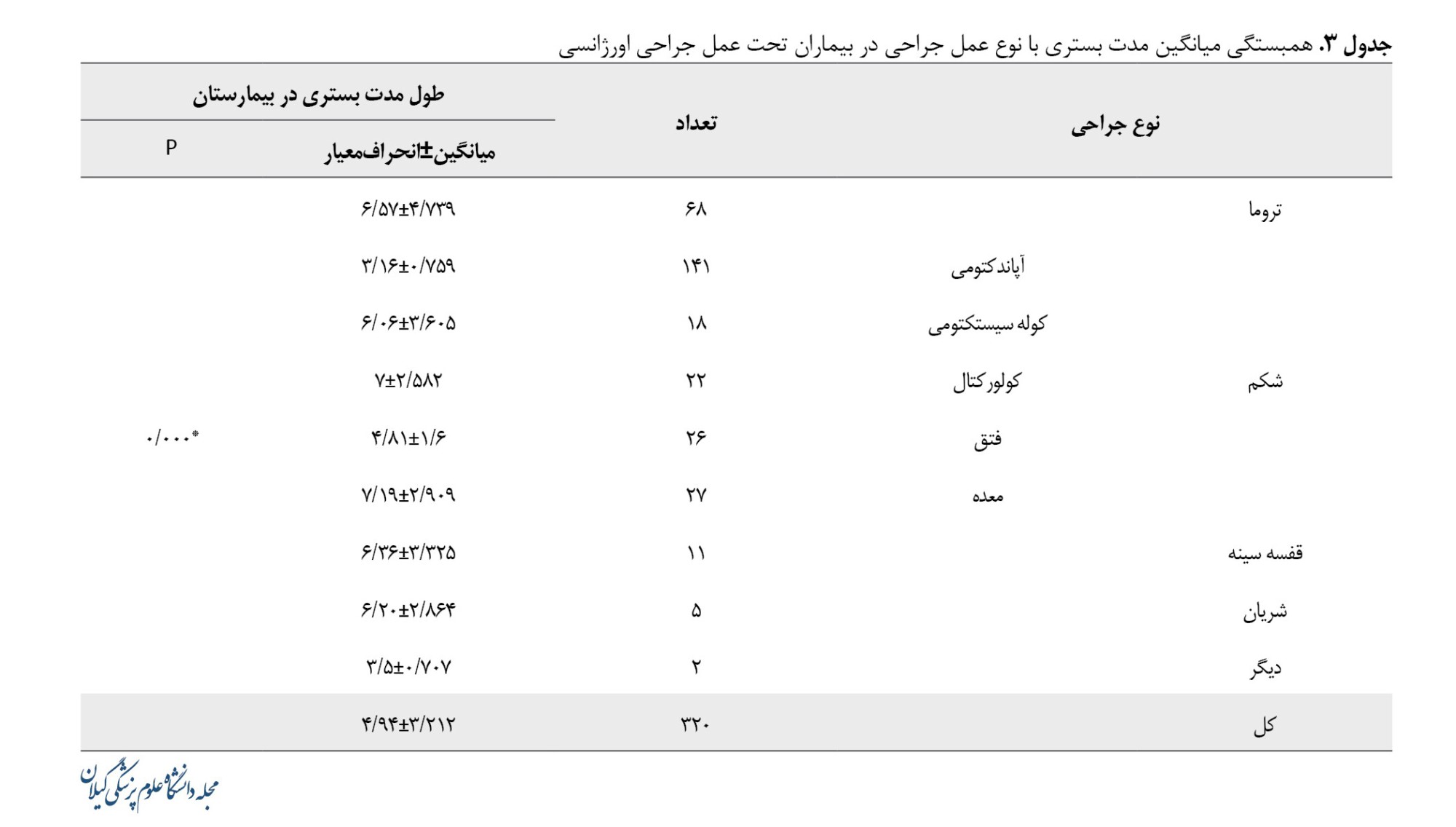 ابتدا فهرستی از بیماران از آرشیو بیمارستان تهیه شد. هر بیمار ارزیابی شد و اندازه نمونه محاسبه شد. نتایج بهدستآمده شامل ارزیابی ۳۲۰ بیمار بود. در این مطالعه، حداقل و حداکثر سن به ترتیب ۱۸ و ۸۶ سال بود و میانگین سن بیماران ۴۰/۴۱±۱۶/۵۱۱ سال بود (جدول شماره ۱). میانگین مدت بستری بیماران تحت عمل جراحی اورژانسی 4/94±3/212 روز بود (جدول شماره 1).
