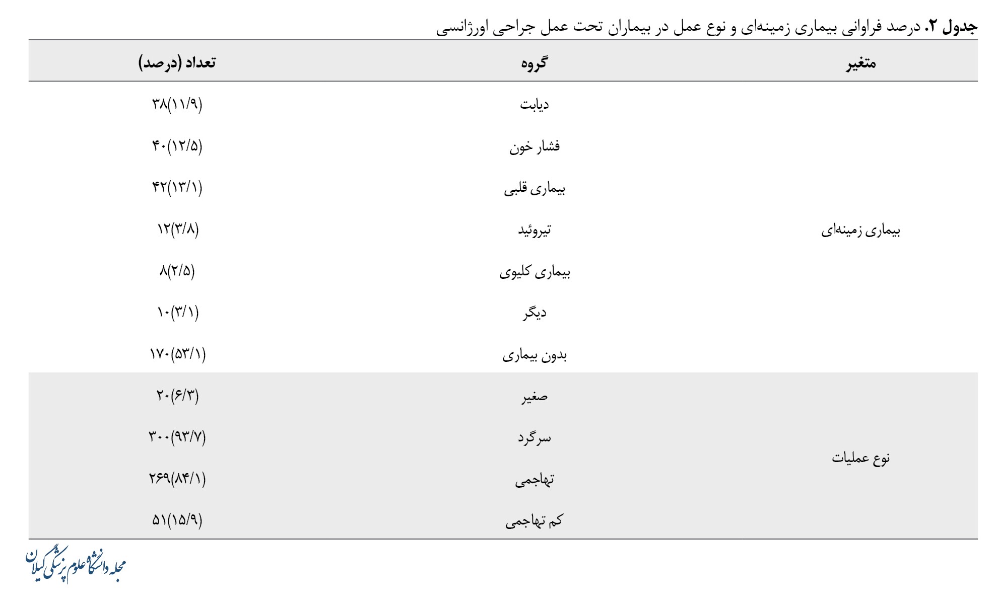 از میان ۳۲۰ بیمار، ۲۰۷ نفر مرد (۶۴/۷ درصد) و ۱۱۳ نفر زن (۳۵/۳ درصد) بودند (جدول شماره ۲). براساس نتایج، ۵۳/۱ درصد از بیماران هیچ بیماری زمینهای خاصی نداشتند و ۱۳/۱ درصد بیماری قلبی داشتند (جدول شماره ۲).
