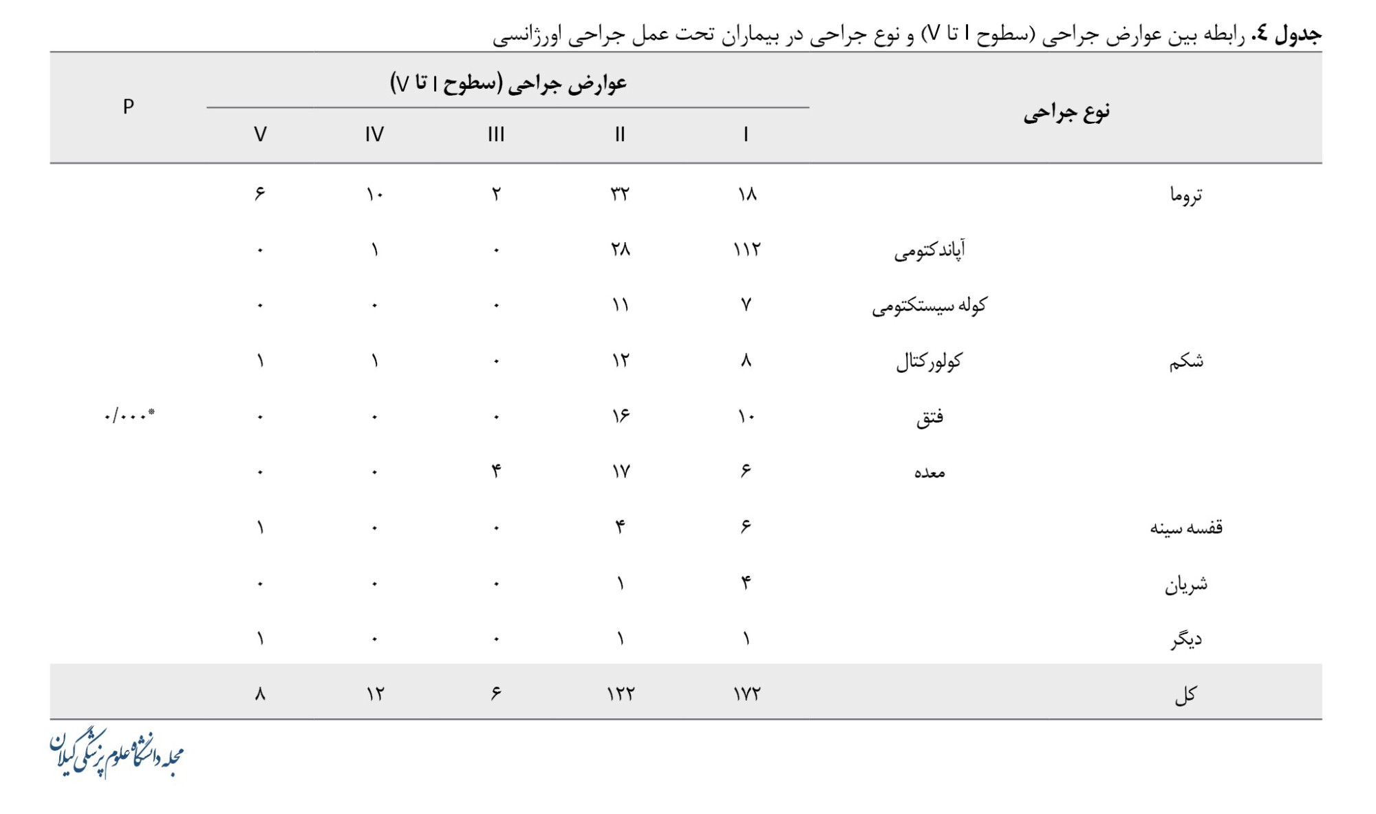 همچنین نتایج آزمون کایمربع نشان میدهد رابطه معناداری بین عوارض جراحی و نوع جراحی وجود دارد؛ بهگونهای که بیماران تروما که تحت جراحی قرار میگیرند، بالاترین نرخ مرگومیر (عوارض درجه ۵) را دارند و بیماران آپاندکتومی معمولاً کمترین تعداد عوارض (عوارض درجه ۱) را تجربه میکنند (جدول شماره ۴).
